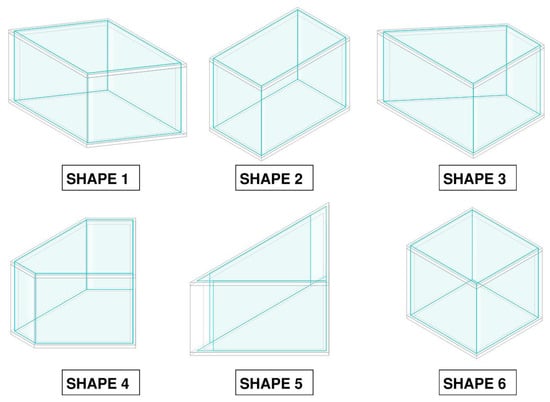 The six models of office rooms are displayed in the form of several surfaces with different colors. The interactive selection box allows the users to adjust the different building internal variables, including building orientation, Window-to-Wall ratio, window glass type, window shading, wall construction, roof construction, building infiltration rate, lighting efficiency, daylighting and occupancy controls, plug load efficiency, HVAC system, operating schedule, PV-Panel efficiency, PV-Payback limit, and PV-surface coverage. Figure 1 displays the analytical models of six different shapes developed in Insight 360. Each model is assigned a number, which is used to identify them in the following contents.
