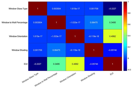 There are several indicators provided by GBS to help designers evaluate building performance. These indicators include energy use intensity (EUI), electric cost, fuel cost, total annual cost, and total annual energy consumption. However, these variables, except EUI, are highly limited by building size and local currency and utility rates. Therefore, energy use intensity (EUI) is chosen as the dependent variable and indicator to evaluate building energy consumption.