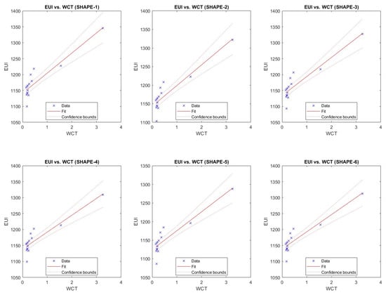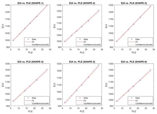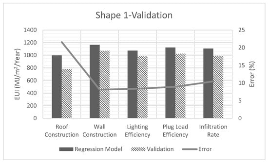 Mottahedi et al. obtained a more accurate prediction with a maximum error of 5% on total energy consumption. The researchers made a multiple linear regression model to predict the energy consumption of an office building with seven different shapes []. The model includes the regression coefficient for each design parameter, and the format is also adopted in this study to generate an MLR model.