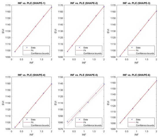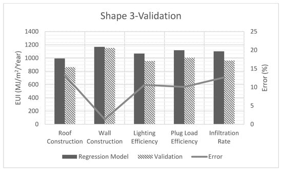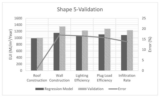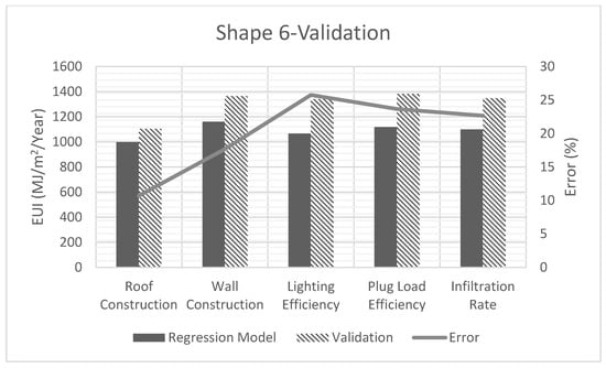 The above figures show the comparison between the regression models and validation models. The error indicates the accuracy of the regression equations. The maximum error was observed at the lighting efficiency of Shape 6, while minor errors were found in the roof construction of Shapes 2 and 4.