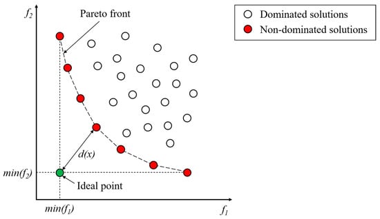 Overall, this study looks into two objectives—discomfort hours and energy (net thermal) consumption—for the office module on a yearly basis. Therefore, the optimal values of the most important design parameters could be determined using the method of Pareto optimality [], which is widely used in the optimisation of multiple objectives for the performance of buildings and building energy systems [,,,,]. Fundamentally, Pareto optimality deals with multi-objective functions that are to be either minimised or maximised, while a scenario of two objective functions can be illustrated in Figure 1.