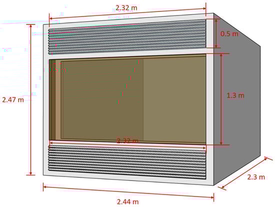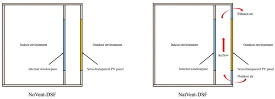 The validated BIPV-DSF model in TRNSYS from our previous research [,] was used for the simulation. The model was a single-room office module with a BIPV-DSF based on a real building test bed developed by Peng et al. [], which could be used in the two desired operation modes for ventilation: Non-Ventilated BIPV-DSF (NoVent-DSF) and Naturally-Ventilated BIPV-DSF (NatVent-DSF). Specifically, the office module had a double-skin façade structure, where an air cavity (0.4 m of depth) was located in between the external and internal layers of the façade, allowing for the operation of the different ventilation modes through the ventilation louvres; a semi-transparent PV panel and a float glass served as the respective external and internal windowpanes. TRNFlow, an external simulation engine of TRNSYS, was used to simulate the natural ventilation through the air cavity. Figure 2 and Figure 3, respectively, illustrate the proposed BIPV-DSF office module with dimensions (the internal and external window dimensions were identical) and the two BIPV-DSF typologies, while their characteristics are further described in Table 4.
