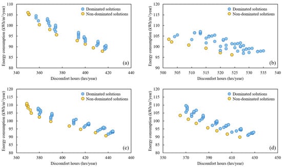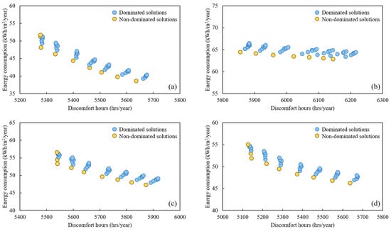 Given that both NatVent-DSF and NoVent-DSF were the most appropriate ventilation modes of the BIPV-DSF for the hot and cold months, respectively, in the warm temperate climate (Sydney), where the hot months fall from September to May while the cold months fall from June to August, the optimisation should take into account the two ventilation modes for the BIPV-DSF, while the optimal Uin and SHGCout should be unique because the window components of the BIPV-DSF cannot be substituted in reality. As can be observed in Figure 5, the Pareto front is indicated based on the non-dominated solutions (the yellow dots) within the given solution space for the combined NatVent-DSF and NoVent-DSF operations across the year, which is apparent although both clusters of dominated and non-dominated solutions are not dispersed to each other to a large extent for all of the scenarios of orientation.