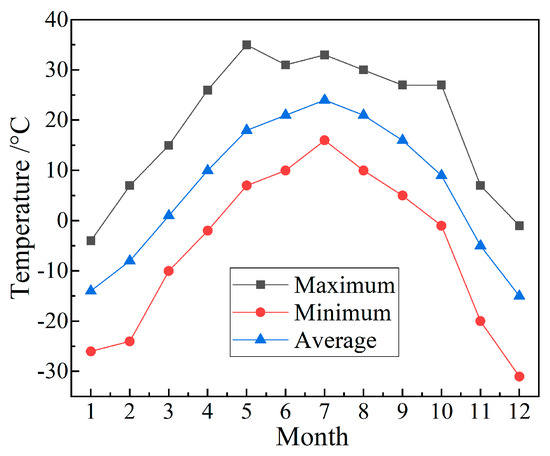 Humans have adapted to the environment through buildings in order to survive, and energy-efficient buildings can minimize the impact of climate conditions on all aspects of human life. When designing buildings in severe cold regions, the building’s thermal insulation in winter should be the focus. China has a vast land area and a complex climate and thus is divided into five climate regions according to the design specifications of building thermal engineering. The severe cold region in China is represented by Harbin city with four distinct seasons: a long winter with low temperatures, a relatively short and comfortable summer, and spring and autumn with quick temperature changes and short transitions. Harbin city has the typical weather characteristics of severe cold regions, with a long cold winter and a short comfortable summer, where the average outdoor temperature approaches 4.5 °C throughout the year with a large temperature difference, as shown in Figure 1.