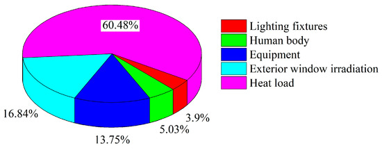 In severe cold regions, under the maximum applicable thermal transmission coefficient of enclosure structure, the overall energy consumption of the heating period is greater than that of the cooling period, and the peak load appears when the indoor and outdoor temperature difference is 55.8 °C, causing the building load difference of 72.91% between cooling and heating periods. Simultaneously, the electricity used by buildings in the heating period is greater than that in the cooling period. As for the heat gain and loss of buildings, the heat gain accounts for up to 41.5%, which is the largest portion of overall energy consumption, mostly because of the significant heat transfer of the building envelope and the unavoidable penetration of gaps in the envelope structure. Furthermore, the contribution rate from transmission and ventilation heat losses to the total heating load approaches 34.7%. Due to large areas of windows and curtain walls in building, the heat radiation from windows accounts for 16.84% of the cooling load, but the overall daylighting effect is obvious, and the energy consumed by lighting fixtures is small, as shown in Figure 5. In addition, there are many office areas in this passive building, thus the energy consumption of equipment is lower than that of exterior window irradiation by 3.09% in the percentage of the total energy consumption.