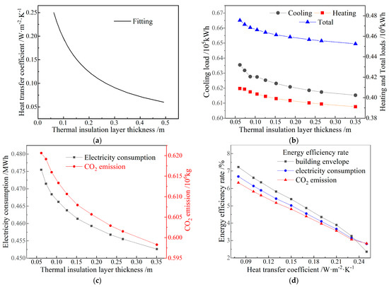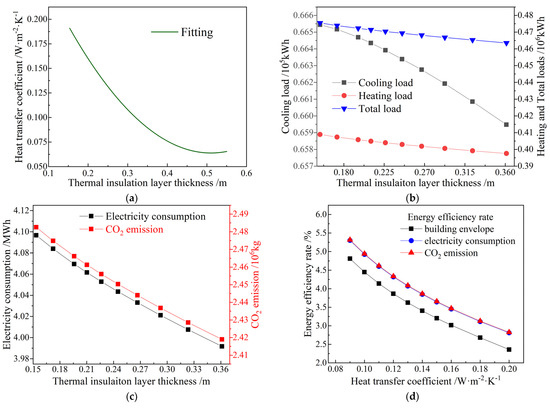 (a) Fitted profile of heat transfer coefficient versus insulation layer thickness, (b) building load energy consumption varying with insulation layer thickness, (c) electricity consumption and CO2 emission in dependence on insulation layer thickness, and (d) energy efficiency versus heat transfer coefficient, for wall envelope.