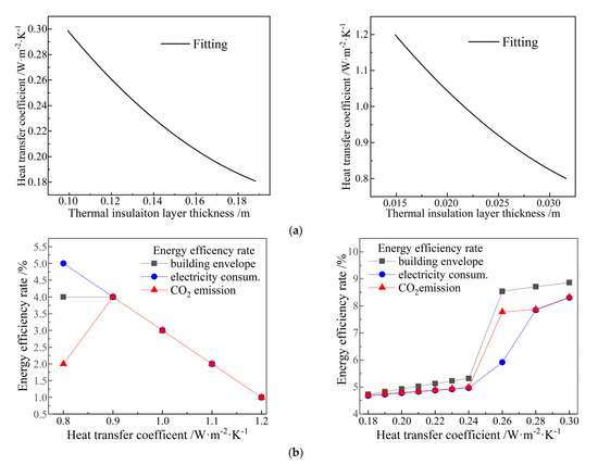 where η stands for energy efficiency percentage; E denotes building energy consumption, Er refers to the energy consumption of the referenced building. A three-layer wall insulation structure with the same inner and outer layer material thickness is chosen, and the thickness of middle insulation structure is set as a single-factor variable. The heat transfer coefficient of 0.2 W/(m2·K) is defined as the upper limit conforming to the design guideline for passive buildings. According to the specified material properties, as shown in Table 7, the relationship between heat transfer coefficient and thermal insulation layer thickness is fitted to simulate energy consumption and CO2 emission of building walls for various wall thicknesses. As shown in Figure 7, the referenced building energy consumption is set as the initial value to calculate energy efficiency. In the thermal insulation layer thicknesses of 0.15~0.55 m based on practical engineering experiences, the heat transfer coefficient of building wall decreases obviously with the increase in thermal insulation layer thickness, as shown in Figure 7a. When the thermal insulation layer thickness is 0.15~0.3 m, the heat transfer coefficient most significantly varies by 0.1~0.35 m. The change rate gradually decreases between 0.3~0.4 m, and the heat transfer coefficient increases when the thickness increases to 0.5 m. After a single linear regression analysis, the quadratic polynomial relationship between heat transfer coefficient and insulation layer thickness for exterior walls is obtained: