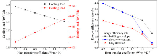 The calculated profiles of building energy consumption throughout the year with respect to exterior window heat transfer coefficient in range of 0.7~1.2 W·m−2·K−1 are shown in Figure 10. The cooling load rises and heating load declines linearly with the increasing heat transfer coefficient of exterior windows, respectively, as shown in the left panel of Figure 10. For every 0.1 W·m−2·K−1 abatement of heat transfer coefficient, the annual cooling and heating loads increase by an average of about 400 kWh (2.7%) and decrease by 2000 kWh (2.5%), respectively. Furthermore, the heat transfer coefficient of exterior windows has a greater impact on heating load than on cooling load. However, as shown in the right panel of Figure 10, the total building energy efficiency decreases monotonically with the increasing heat transfer coefficient of exterior windows, especially in the range of 1.1~1.2 W·m−2·K−1 by 1.21%. In the range of 0.7~1.0 W·m−2·K−1, the energy efficiencies of building envelope and electricity consumption are almost identical, which meanwhile are evidently greater than that of CO2 emission.
