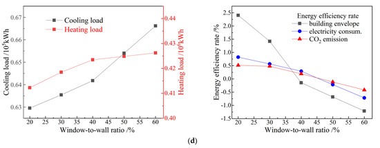 Building load (left panels) and energy efficiency (right panels) in dependence on the window-wall ratio of (a) east, (b) south, (c) west, and (d) north facades.