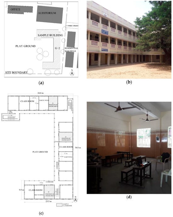 The experiment was conducted in a naturally ventilated classroom in an established typical school in Chennai. Many institutes have expanded their campus infrastructure since 1990 by building new structures with modern materials and technology to accommodate their growing requirements. These buildings are primarily ground-plus-two-story naturally ventilated structures. Only a few individual rooms, such as computer laboratories and the office area, are air-conditioned. In this study, a field investigation was carried out for one such school building in Chennai, as shown in Figure 1. The architectural design details and quantitative environmental data of the identified school building were collected to assess the thermal performance of the building envelope.