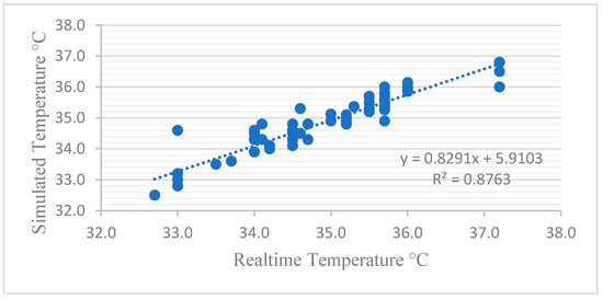 The simulated values and the field study results of the sample classrooms were compared using regression analysis. The R-square was found to be 0.8764, indicating a very strong and good association of correlation (Figure 4). The validation was checked using regression analysis for each sample classroom so that further retrofit iterations simulated in the model would be close to the actual results for the building.