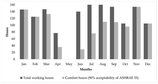 The building does not have a west wing. Therefore, the northwest and southwest corner classrooms were considered for the west orientation simulation study. The whole-building analysis of the simulation showed that the reference building is comfortable up to 76% of the 90% acceptability status of the ASHRAE 55 adaptive model [32]. April–August months are comfortable for less than 70% of the time (Figure 5). The simulation study results indicate that the reference building provides a comfortable environment for its occupants for a significant portion of the year. Specifically, the north, east, and south wings are comfortable 79%, 83%, and 82% of the time, respectively. However, the northwest and southwest sides are only comfortable 66% and 71% of the time, respectively, annually. Furthermore, the study also reveals that the comfort level varies by floor. The ground floor offers the most comfortable environment 82% of the time, followed by the first floor at 79% and the second floor with 67% per year.