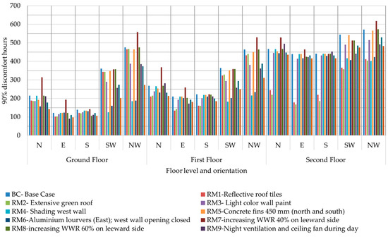 A fundamental strategy for lowering the room air temperature of a low-rise building in the equatorial zone is to reduce heat gain through the roof [38]. The BC building’s second (topmost) floor showed the maximum temperatures and discomfort hours. The top level is the most crucial for achieving thermal comfort due to heat gain from the roof [38]. The northwest and southwest classrooms at all levels also had the most discomfort hours due to west exposure. The various retrofit interventions were simulated to increase cross-ventilation, reduce heat ingress, and increase window shading. The thermal performances were compared with the existing reference building for two retrofit packages, as mentioned in Section 2.5.1. The most impactful retrofits for reducing the discomfort hours were on the second floor due to roof retrofits (RM1 and RM2), up to 62%, and lower floors due to west wall retrofits (RM4 and RM6), up to 65% (Table 3 and Figure 6). It was observed that, as an independent retrofit measure, adding concrete fins to the north and south wall (RM5) had the adverse effect of increasing the discomfort hours. Moreover, increasing WWR (RM7 and RM8) had a minimal impact in reducing discomfort hours across all floors Figure 6.