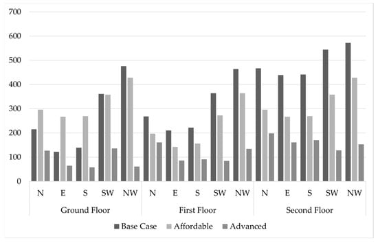 Considering the 9.00 am–4.00 pm working hours, Figure 7 shows the trend of discomfort hours for the two retrofit packages for each orientation and floor level. The whole-building simulation study showed a 7% increase in comfort hours due to the affordable retrofit package and a 17% increase for the advanced retrofit package. There are increased discomfort hours on the ground floor in the cardinal directions for the affordable retrofit package. As an integrated measure, the crucial second floor (up to 39%) and the west wall (up to 87%) had the highest reductions in discomfort hours.