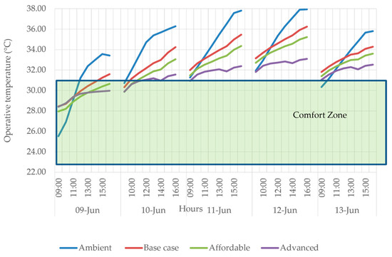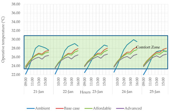 The peak winter week appears in the fourth week of January. The affordable package slightly reduces the temperature by 0.41 to 0.75 °C in the afternoon session. The advance retrofit considerably reduces temperatures by 1.02 to 3.38 °C from morning (11.00 am) to evening (4.00 pm) (Figure 8). The peak summer week occurs in the second week of June, once the school reopens for the academic year after a summer vacation break. The affordable retrofit package shows an impact on the reduction in the temperature around 0.8 to 1.18 °C from 1.00 to 4.00 pm. A study in Nigeria showed a reduction of up to 3 °C with minimum retrofit interventions [39]. The advance retrofit package significantly reduces the temperature by about 1.32 to 3.16 °C through the working hours of 9.00 am to 4.00 pm (Figure 9). Though there is a considerable reduction in temperature, the retrofit measures for naturally ventilated conditions cannot completely address the occupant discomfort during the summer of hot, humid climatic regions. Therefore, air conditioning in the classrooms during summer might be a possible solution to attain comfortable conditions with minimal energy usage. After applying the retrofit strategies, it was found that the case study building with a classroom area of 2013.2 m2 would require 43,490 kWh of energy annually, considering the uncomfortable months of April, June, July and August, if split-unit air conditioning with a cooling set-point of 24 °C and minimum fresh air of 5 litres/second per person were used. This equates to a 15.35% energy reduction compared to the BC. According to the literature, active and passive measures should be integrated into building design to maximise energy efficiency [40].