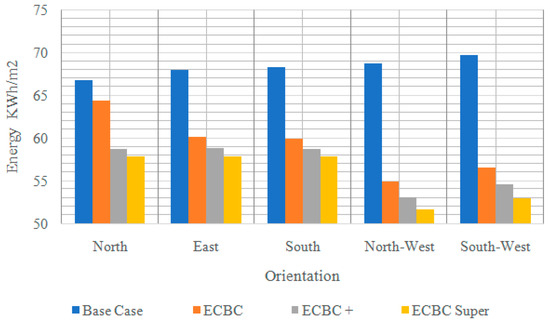According to a study by [41], envelopes designed to meet the Energy Conservation Building Code (ECBC) criteria provide a significantly improved thermal comfort environment for workers, allowing them to spend 60% of their working hours in comfort, compared to the traditional envelope specifications used in India. The study also found that implementing ECBC building envelopes improves energy efficiency in buildings [41]. In this study, classrooms on the northwest side were impacted the most, with 14% (ECBC), 16% (ECBC+), and 17% (Super ECBC) increases in energy savings from the BC, as illustrated in Figure 10. The energy savings were similar for the three ECBC packages. Higher results have been found in other composite climate studies, which have proposed improved glazing and roof insulation for increased thermal comfort [41].