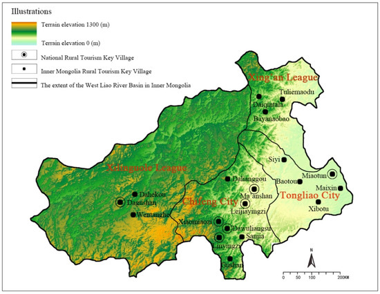 The rural areas in the Western Liao River Basin in Inner Mongolia are rural settlements where Han and Mongolian people gather, among which the rural settlements where Mongolian people gather are called Gacha [44]. Nineteen typical rural areas in four prefecture-level cities (seven Qis and counties) in the Western Liao River Basin in Inner Mongolia are used for the study, including eight in Chifeng City, five in Tongliao City, three in Xing’an League, and three in Xilinguole League. These rural areas are representative because they are different batches and grades of national rural tourism key rural areas and Inner Mongolia rural tourism key rural areas (see Table 1).
