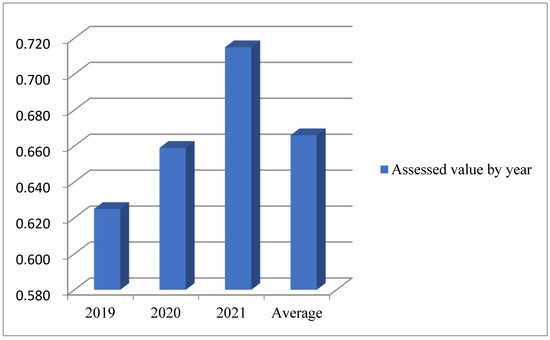 (1) Analysis by year. From Table 3 and Figure 1, it can be seen that the overall assessed value of rural preservation and inheritance in the Western Liao River Basin in Inner Mongolia, China, is 0.666 from 2019 to 2021, 0.625 in 2019, 0.659 in 2020, and 0.715 in 2021. The rate of increase in 2021 is faster than that of 2020, and the growth rate of assessed value increases year by year, with an average annual growth rate of 6.96% of assessed value.
