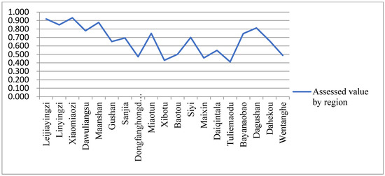 (2) Analysis by region. As can be seen from Table 3 and Figure 2, the top six rural areas in the assessment of the preservation and inheritance value of rural in the Western Liao River Basin, Inner Mongolia, China, in 2019–2021 are Xiaomiaozi, Leijiayingzi, Ma’anshan, Linyingzi, Dagushan, and Dawuliangsu; the middle seven rural areas are Miaotun, Bayanaobao, Siyi, Sanjia, Dahekou, Gushan, and Daiqintala; the last six rural areas are Baotou, Wentanghe, Dongfanghongdalianggou, Maixin, Xibotu, and Tuliemaodu. The average value of eight rural areas in Chifeng is 0.772, five rural areas in Tongliao is 0.567, three rural areas in Xing’an League is 0.568, and three rural areas in Xilinguole League is 0.653. It can be seen that rural areas in Chifeng generally perform better than rural areas in other cities in terms of heritage value assessment.