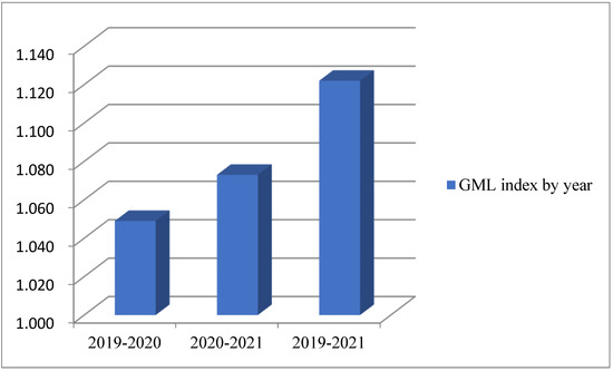 (1) Analysis by year. From Table 4 and Figure 3, it can be seen that the GML index for assessing the value of rural preservation and inheritance in the Western Liao River Basin, Inner Mongolia, China, is 1.122 in 2019–2021. Among which, the GML index is 1.049 in 2019–2020 and 1.073 in 2020–2021. It can be seen that the GML index shows an increasing trend over the past three years.