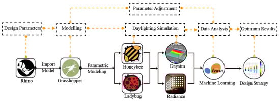 Although the above research can improve the precision of lighting design, the current environmental simulation tools have professional barriers, and there is a lack of reliable interfaces among various environmental simulation and evaluation tools. A large amount of environmental simulation analysis software is time-consuming and inefficient, and cannot provide effective support for the performance-driven design process. Therefore, it is vital to improve the efficiency of the corresponding lighting simulation tools and the friendliness of tool operation, and increase the research on the universal plug-in interface and platform. e Silva introduced a parametric design method to measure the energy performance of buildings; all simulations and optimizations were accomplished on a single platform, using Grasshopper and its plug-ins Ladybug, Honeybee and Galapagos, compared with the traditional method, and it not only improves the accuracy of simulation but also saves time []. Kamel set up a parameterized workflow for evaluating outdoor thermal comfort. Compared with other current methods, this workflow has considerable universality through Ladybug and Honeybee, and Butterfly plug-ins on the grasshopper interface, and can be used for parameterized research on indoor and outdoor environments []. The above study shows that the natural light performance simulation tool developed based on the parametric simulation platform can significantly simplify the modeling process and improve the efficiency of natural light performance simulation.