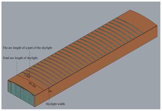 Meanwhile, sDA, UDI and DGPexceed are taken as the optimization design objectives. The building environment information model is used to orderly overlay the building information of material and structure, geometry of the waiting hall. The initial model of the waiting hall established has a rectangular plan format. The length of east–west and north–south directions are 318 m and 68 m, respectively, the section form is curved, and the height of the waiting hall is 18 m. Regarding the variation in the building height, the sidewalls are adjusted, while the roof shape remains the same. According to the research and literature, the widely used strip skylight is adopted, 28 strip skylights are evenly distributed, the width of each skylight is 1.0 m and the ratio of skylight is 0.15. For the change in skylight area, the width of skylight is mainly adjusted while maintaining the layout form of skylight. In order to create a more realistic light environment in the waiting hall, the strip skylight is divided by 26 grids across the skylight opening, and the width of each grid is 50 mm, which divides the strip skylight into 27 parts, with the arc length of each part being 1.6 m, and the layout form of the skylight is described in detail by axonometric drawings. In addition, the thickness of the roof was set to 300 mm after reviewing the literature. Meanwhile, two side windows are set on the east and west sides of the waiting hall; because the depth of the waiting hall is large, it mainly relies on the skylight. Since the waiting hall is deeper and mainly relies on the skylight for lighting, the east and west side windows are set to constant values. In order to obtain more accurate natural lighting prediction accuracy, the optical properties of various materials in the waiting hall are set, including the reflection ratios of walls, ceilings, floors and the transmittance of window glass. The reflectance of white wall and ceiling in the waiting hall is 0.805, the reflectance of beige ground is 0.500 and the transmittance of skylight and side windows are 0.69. The constructed parametric model is shown in Figure 3.