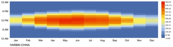 First of all, the simulation data are collected in advance, which can be divided into building sky model, giving material structure properties and setting environmental parameters. The building case is located in Harbin, a typical cold city, with an average annual sunshine time of 4.4 h and a short winter sunshine time. As can be seen from Figure 4, the monthly average sunshine radiation in Harbin reaches the maximum value in June, then gradually decreases, and reaches the minimum value in winter. In view of the distinct regional climate characteristics in cold regions, this study started from the actual observation, corrected the Perez sky model by using the measured data and generated a sky model reflecting the real sky state in Harbin, namely the modified Perez sky model, which improved the accuracy of reflecting the local light climate environment. The sky brightness distribution is obtained by calculating the sky clearness index and sky brightness index from the measured sky radiation values. The Perez sky model based on the photoclimatic characteristics of the cold region is obtained by replacing the radiation values in the database with the sky brightness distribution calculated based on the measured data, and thus correcting the Perez sky used in the dynamic lighting simulation process. The replacement of radiation values in the database with measured values is intended for comparison with specific summer and winter measurements. The six days of measured solar radiation data were imported into the Harbin weather data package, changing only the solar radiation values for these six simultaneous days, and not for the rest of the year’s weather data. Then, based on the measured optical properties such as reflectivity and transmittance of building materials in the waiting hall, the designer created the optical property dataset of commonly used materials in the waiting hall. The designer can call the optical property data of different materials according to the needs, and build an adaptive correlation relationship with the parameters of the waiting hall, so as to avoid the repeated modeling caused by the adjustment scheme and reduce the time consumption of simulation experiments. In this paper, according to the optical properties of the waiting hall and indoor materials needed for natural lighting performance simulation and the data requirements of the sky model, the data of the waiting hall and environment in cold regions are imported into simulation software such as Ladybug 1.6 and Radiance 5.4a, and the simulation software are used to calculate the natural lighting performance index.