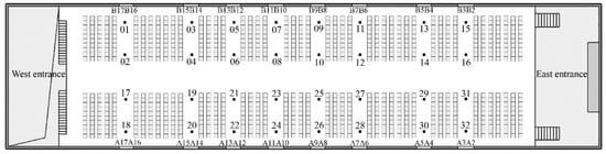 In the simulation of natural lighting performance, it is necessary to verify the accuracy and reliability of software simulation. The light environment of the waiting hall in Harbin West Railway Station was measured on the spot. The height of the test was 0.75 m, and 32 measuring points were selected. The testing time was from 1 August to 3 August 2019 and from 11 December to 13 December 2019, and the measuring time was from 8:00 to 17:00. During the actual measurement, all the artificial lighting devices in the waiting hall were turned off and only had natural lighting. The distribution of measurement points is shown in Figure 5.