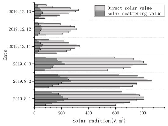 In order to obtain the Perez sky model based on local photoclimatic characteristics, the outdoor sky radiation value was measured at the same time as the indoor illuminance during the actual measurement, and the observation site was located in the East Square of Harbin West Station. Sky conditions during the measurement period included cloudy skies and sunny and cloudy weather conditions. The weather conditions during the measurement included cloudy, clear and cloudy. The measurement meets the relevant requirements of “Light Measurement Methods” (GB/T 5699-2013). The experiments were conducted in two seasons, summer and winter, and the test time points were from 8:00 to 17:00. The solar radiation at the measurement points was recorded once every 1 h, and the arithmetic mean of all measured values at each measurement point was used as the final result for analysis. Figure 6 shows the measured outdoor radiation values.
