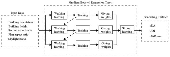 In addition, in order to assess the natural lighting performance of the waiting hall in a timely manner, an efficient and accurate prediction method needs to be found. Traditional forecasting methods use software such as EnergyPlus V9.0.1, DesignBuilder 7.0, Ecotect 2021, etc., which require input parameters involving a large number of detailed descriptions of space and skin, building structure, equipment, operation mode, etc., and lots of information is difficult to obtain in the early design stages. The limitations of traditional forecasting models make it difficult to predict the physical environment of buildings efficiently [,,], while machine learning makes up for the shortcomings of traditional tools in terms of efficiency and accuracy. In order to quickly obtain energy-related feedback in the early design stage, Hygh developed a multivariate linear regression model based on a dataset of 27 design parameters. It was found that it is very consistent with the simulation results and becomes an effective decision support tool for designers []. Turhan used artificial neural networks to forecast the thermal load of existing design parameters. The results show that under the given conditions, the prediction results of the artificial neural network were highly consistent with those of the building energy simulation tool, with a prediction success rate of 0.977 []. However, there are limitations when traditional machine learning algorithms try to learn and predict the light environment of the waiting hall. Traditional machine learning is not good at dealing with nonlinear problems. Aiming at tackling this problem, this paper proposes a gradient boosting regression tree (GBRT) prediction model [], which has high prediction accuracy and efficiency in dealing with high-dimensional nonlinear problems, as an interpretable machine learning theory can make the model transparent, allowing designers to understand the decision-making process and build trust between people and the model. On this basis, by introducing explainability into the dynamic light environment prediction in waiting halls, the interpretation of inductive preferences of the model is added to the harvest regression model, and the different contributions of design factors to light environment metrics are summarized [].