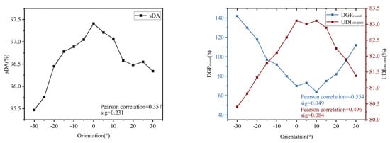 The design parameters of the building orientation were studied, and the range of the building orientation was controlled from −30° to 30°, the step size of the orientation design parameter was set to 5°, and the model of the waiting hall was rotated by using the control variable experiment method, keeping the other design parameters unchanged; the effects of different building orientation changes on the performance of the lighting evaluation indexes sDA, UDI and DGPexceed were studied on the parameterized simulation platform.