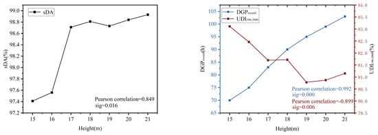 In this section, by sampling the morphological parameters of the waiting hall scheme, the height range of the waiting hall was controlled within 15~21 m, and the simulation step was set to 1 m. While keeping the other design parameters unchanged, the effects of the changes under different building heights on the performance of lighting evaluation indexes were calculated on the parametric simulation platform.