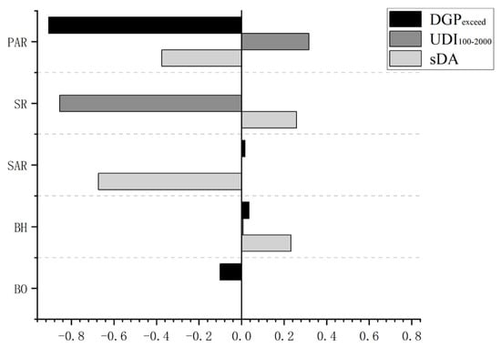 As shown in Figure 9, the building orientation shows little correlation with sDA and UDI. Only DGPexceed is significantly correlated with building orientation. During the change in the building orientation parameter from −30° to 30°, sDA, UDI and DGPexceed all show periodic changes, and the change in orientation shows similar effects on sDA and UDI performance targets. sDA grows rapidly from −30° to 0°, and then decreases; the reason for this phenomenon is that when the orientation is 0°, more natural light enters the waiting hall, which improves the quality of the natural light environment. sDA decreases significantly at −30°. The building orientation reaches the maximum at 0°, which obviously improves the satisfaction rate of natural lighting. UDI100–2000 reflects the number of hours within the effective illumination range throughout the year. UDI100–2000 at 0° reached the maximum value. With the change in building orientation, the value of DGPexceed is lower in the range of 0~10°, and the passengers in the waiting hall are not easily disturbed by the glare.