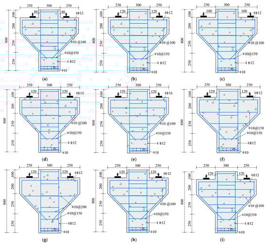 Specimens’ dimension and reinforcement arrangement: (a) MC01 specimen; (b) MC02 specimen; (c) MC03 specimen; (d) MC04 specimen; (e) MC05 specimen; (f) MC06 specimen; (g) MC07 specimen; (h) MC08 specimen; (i) MC09 specimen.