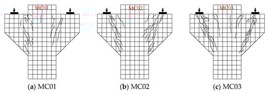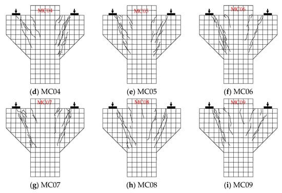 The crack distribution of the specimens is shown in Figure 3. It can be seen that the cracks that appeared when the corbel was incorporated into the steel-fiber concrete were tiny. The reason is that the corbel specimen with steel fibers continued to transmit the tensile stress even after the appearance of cracks, relying on the bridging effect of the steel fibers between the cracks. The external manifestation of this phenomenon was that multiple cracks appeared on the surface of the specimen [,]. We further explored the effect of steel fibers on cracks. As the steel fiber content increased from 0% to 0.75% and 1.5% (Figure 3b,h,i), the crack morphology changed significantly, and the crack area of the specimen gradually became larger, while the crack width decreased. It showed that the steel fibers had an obvious strengthening and toughening effect on concrete and could effectively improve the cracks. In addition, with the same steel fiber content, the fracture morphology remained basically similar.