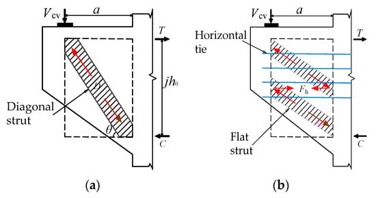 where a represents the shear span value, which is defined as the distance to the vertical load Vcv; h0 denotes the effective depth of the corbel section; jh0 is the lever arm, which is the main reinforcement of the corbel against the resultant compressive stress of the concrete compression zone.