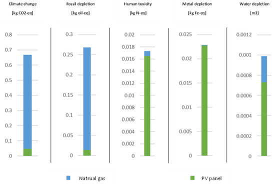 It is clearly observed from Figure 3 that metal depletion and water depletion are expected to increase more by using PV panels compared to natural gas. The impacts on these two categories are attributed to the manufacturing process and production and mining of structural elements of the PV panels, especially metal components. However, the impact on water depletion, even for the PV panel, is relatively small (0.000732 m3/kWh) and consistent with the range reported in other studies from 0.00002 to 0.00109 m3/kWh [83]. On the other hand, the PV panels could have a significant impact on the metal depletion category of 0.0227 kg Fe-eq, whereas using natural gas has an impact of 0.000115 kg Fe-eq. Considering efficient recycling strategies for the main elements can reduce resource depletion [81].