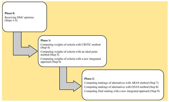 This step computes the final rankings of alternatives by considering the integrated value . The final rank is computed with descending degrees of alternatives’ scores. The framework of the introduced model is shown in Figure 1.
