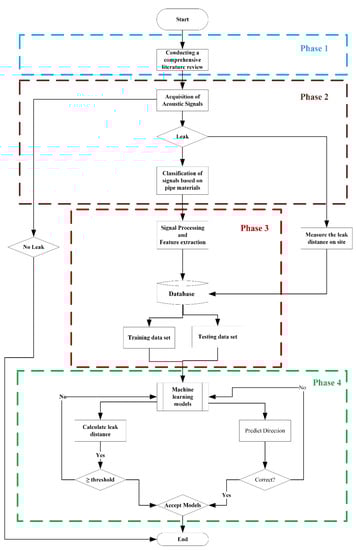 The concept utilizes the features extracted from the acoustic signals generated and recorded with noise loggers connected to the WDNs. The detailed explanations of the different phases (see Figure 1) involved in this study are as follows: