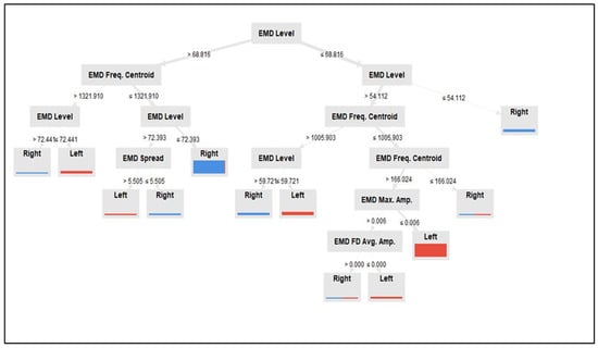 A decision tree technique is a tree-like model based on supervised learning and is widely used in many machine learning problems. The DT structure comprises several internal nodes, branches, and leaves. Notably, each internal node of the trees shows a test on an attribute. Since the decision tree produces a visual flowchart as an outcome, it can be easily interpreted and understood. Another advantage of the decision tree is that it requires less effort and computation time than other techniques [,,]. The tree structure is presented in Figure 3, and Table 3 shows the parameters used to develop the decision tree model in this study.