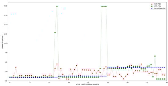 Visualization of the predicted and actual leakage distances for ensemble k-NN and LibSVM with PCA.