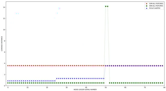 The predicted leakage and actual leakage distances can be visualized in the plots shown in Figure 4. The three noise loggers were stationed at three different distances (0.9 m, 1.314 m, and 3.556 m) from the three leakage spots, see Section 2.2.1. Most points recorded validation errors of less than 1 m, with a few data points having high variations. K-NN has six data points with wider marginal errors, and it is noteworthy to recall that normalization and outlier detection were not considered during the data processing stage.