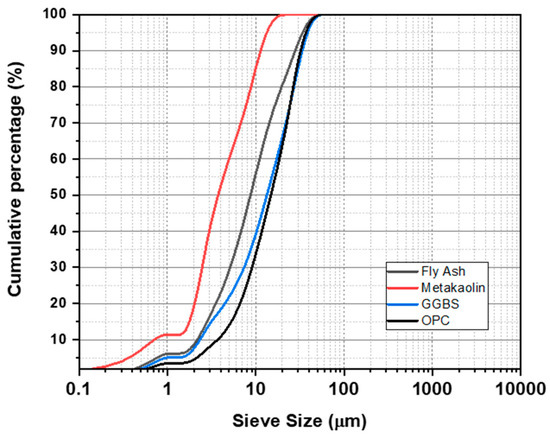 Class F fly ash was obtained from the Raichur thermal station in Karnataka, India. Metakaolin and GGBS were received from the Astraa-chemical industry, Chennai, Tamil Nadu, India. The aluminosilicate binder’s particle size analysis was performed using CILAS 1064. The particle-size distribution of the studied low-calcium and high-calcium aluminosilicates is illustrated in Figure 1. The physical and chemical properties of low-calcium and high-calcium aluminosilicates are shown in Table 1. The aluminosilicate binders were found to satisfy the pozzolana activity per clauses prescribed in ASTM C618 [44].