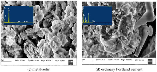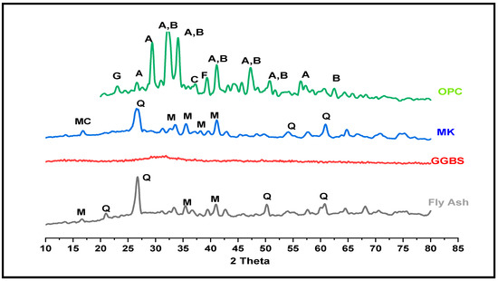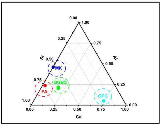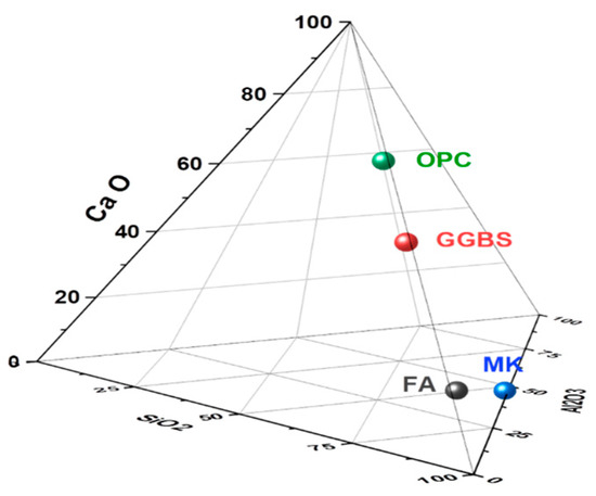 Phases of the aluminosilicate binders were plotted as a 3D ternary diagram, as shown in Figure 2, a handy tool to compare CaO, SiO2, and Al2O3 in the aluminosilicates selected for the present study. Table 2 shows that the OPC’s highest calcium oxide is present while the lowest is in the MK. About 42% of calcium oxide is present in GGBS against 4.7% in fly ash. The FESEM (field emission scanning electron microscopy) of the binders (Figure 3) indicated that the morphology of the aluminosilicate materials differ from each other in that fly-ash is spherical, while GGBS exhibits angular morphology and metakaolin appears flaky. Cement exhibits a combination of angular and flaky morphology. XRD (X-ray diffraction) of the aluminosilicate materials is shown in Figure 4.