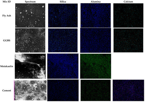 EDS spectroscopy of the aluminosilicate materials studied is shown in Figure 3. EDS mapping of aluminosilicate material is illustrated in Figure 5. EDS mapping identified calcium, silica, and alumina in the FA, MK, GGBS, cement, and other minor elements. From Figure 5, the strongest calcium intensity is noticed in the cement, followed by GGBS and FA, while there is no calcium found in metakaolin. The EDX elements of the aluminosilicate binders are tabulated in Table 2. Si/Al ratios of OPC, GGBS, FA and MK are 4.25, 2.03, 1.57 and 0.97, respectively, whereas the Ca/Si ratios are 3.54, 1.14, 0.06 and 0.00, respectively. The ca/Al ratio is 15.02 in cement, the highest amongst the samples studied, while in GGBS, it was found to be 2.31, and in FA and MK, it was 0.