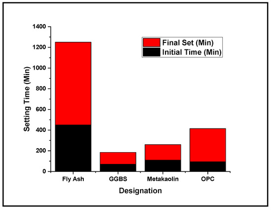 The setting time test was performed using the Vicat apparatus for three popular binders fly ash, GGBS, MK, and OPC pastes. The initial setting time of fly-ash, GGBS, MK, and OPC pastes are 450, 70, 110, and 95 min, respectively. The final setting time of the fly-ash, GGBS, MK, and OPC pastes were 810, 115, 150, and 295 min, respectively. The initial and final setting times were noted at 5 min intervals, as illustrated in Figure 6. The calcium oxide content in the alkali-activated fly-ash, metakaolin, and GGBS pastes were 4.7, 0.09, 42%, respectively, and the OPC paste is 59.67%. The setting time was found to be significantly influenced by the calcium content. Alkali-activated fly ash, metakaolin, and GGBS contain higher calcium content exhibited faster-setting characteristics.