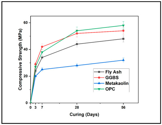Alkali-activated fly ash, GGBS, and MK mortar were tested for compressive strength after curing for 3, 7, 28, and 56 days in the ambient conditions and compared with the strength of OPC mortar water cured at ambient conditions. Figure 7 shows a plot of the mortars’ tested compressive strength. The compressive strength of alkali-activated fly-ash, GGBS, and MK mortar at 56 days is 48.22, 54.65, and 32.42 MPa, respectively, and of the OPC mortar is 58.14 MPa. The compressive strengths of alkali-activated fly ash, GGBS, and MK mortar are 17.06%, 6%, and 44.32%, respectively, lower than the strength of the OPC mortar.