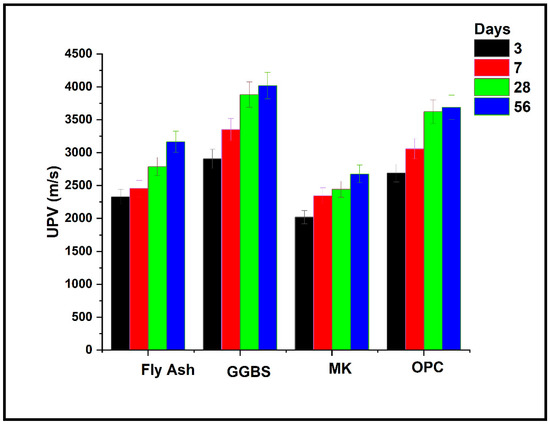 The UPV results for the aluminosilicates tested on the mortar samples are shown in Figure 8. The UPV values for alkali-activated fly ash, GGBS, and MK mortar were 3166, 4020, and 2676 m/s after 56th days of air curing, while after the seventh day of curing, UPV values were 2456, 3352, and 2346 m/s. The UPV value of OPC mortar at 56 and seven days were 3689 and 3057 m/s.