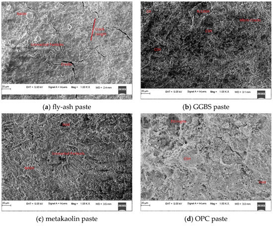 OPC paste can be compact and dense, with fewer cracks and tiny pores. The presence of calcium hydroxide (Ca (OH)2) flakes is observed in GGBS paste while there is almost negligible FA and MK. MK paste is observed to be least dense with fragmented compounds and unreacted particles. OPC paste is denser among all the pastes studied, while the alkali-activated GGBS paste is denser than the FA and MK paste. The alkali-activated fly ash has a higher crack length than other pastes studied. Furthermore, the NASH gel (a three-dimensional structure) is more stable than calcium-based gel types [63,64,65].