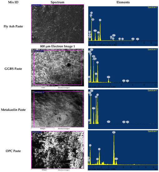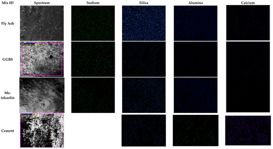 Energy dispersive spectroscopy (EDS) and mapping were explored to understand the chemical composition of low-calcium alkali-activated (fly ash and MK) and high-calcium alkali-activated (alkali-activated GGBS and OPC) pastes. The EDS elements are tabulated in Table 5. The elemental spectrum of pastes is shown in Figure 11. Elements identified in alkali-activated FA, and MK pastes were Na, Si, Al, and Ca. The GGBS paste contained insignificant Na, Si, Al, and Ca proportions. For the OPC paste, the elements present were Si, Al, and a high ratio of Ca was observed in the binder system.